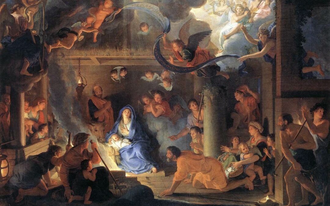 Pour commencer, émerveillons-nous devant l’Enfant-Dieu qui, par la Foi, éclaire notre intelligence pour connaître Dieu et son dessein. « Le peuple qui marchait dans les ténèbres a vu se lever une grande lumière ; et sur les habitants du pays de l’ombre, une lumière a resplendi. » (1° lect.) Les ténèbres sont le symbole de notre ignorance. Le philosophe Platon avait compris que nous vivions tous dans une caverne sans le savoir, que la lumière du soleil nous était cachée, et que seule la connaissance pouvait nous permettre de sortir au grand jour. Mais la raison est impuissante à découvrir seule la vérité, elle a besoin de la révélation de Dieu. Le Fils de Dieu s’est incarné parce qu’il est la Parole du Père (le Verbe fait chair) et pour nous donner l’Esprit qui nous guide « vers la vérité tout entière » (Jn 16,13). Mais pour le moment, il est un nouveau-né qui ne sait pas encore parler. Sans la parole, il nous enseigne que Dieu n’est pas l’Etre suprême dont nous devons avoir peur, Zeus courroucé prêt à lancer des éclairs et la foudre. Le Tout-Puissant se rend vulnérable, le Très-Haut gît sur le sol, Celui que les cieux ne peuvent contenir pourrait être écrasé par les sabots de l’âne ou du bœuf… Plus tard, Jésus exultera et dira, sous l’action de l’Esprit Saint : « Père, Seigneur du ciel et de la terre, je proclame ta louange : ce que tu as caché aux sages et aux savants, tu l’as révélé aux tout-petits. » (Lc 10,21) Il est le tout-petit par excellence, et il nous invite à nous abaisser avec lui. Comme le dira Jean : « Lui, il faut qu’il grandisse ; et moi, que je diminue. » (Jn 3,30)