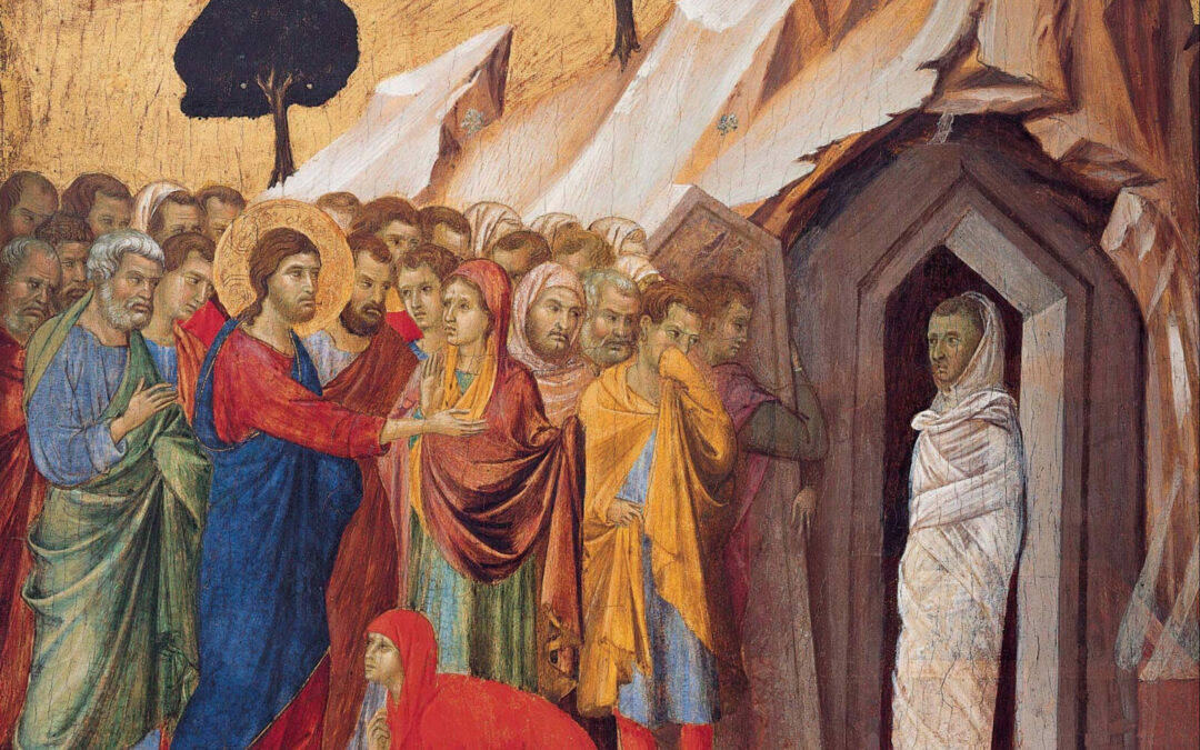 Frères et sœurs, comment pouvons-nous vivre davantage ? Le Christ est venu pour que nous ayons la vie, la vie en abondance (Jn 10,10). C’est pourquoi il dit à Marthe : « Quiconque vit et croit en moi ne mourra jamais.» Il l’appelle à passer de la foi en la résurrection finale, que Marthe professe au sujet de son frère (« je sais qu’il ressuscitera à la résurrection, au dernier jour ») et que nous professons nous aussi chaque dimanche, à la foi en la résurrection ici et maintenant, possible si nous sommes unis à lui, qui est « la résurrection et la vie ». Jésus ne parle pas ici de la mort physique, qui est inéluctable, mais de la mort spirituelle, qu’il a évoqué ailleurs : « laissez les morts enterrer les morts. » (Lc 9,60)[i] Le Christ nous ressuscite pour nous conduire jusqu’à son Père et nous donner d’entrer dans l’intimité qui les unit tous les deux, dans l’Esprit Saint. Cette intimité nous est révélée d’une façon magnifique dans l’évangile de ce dimanche : « Père, je te rends grâce parce que tu m’as exaucé. Je le savais bien, moi, que tu m’exauces toujours » dit Jésus avant même de commander à Lazare de sortir de son tombeau. Comment pouvons-nous entrer dans cette vie divine ? Contemplons Jésus pour franchir les 5 étapes qui ont conduit à la résurrection de Lazare. Premièrement, apprenons à ne pas nous précipiter. Deuxièmement, pleurons avec ceux qui pleurent. Troisièmement, ouvrons les tombeaux. Quatrièmement, sortons au-dehors de ceux-ci. Cinquièmement, délions ceux qui sont prisonniers.